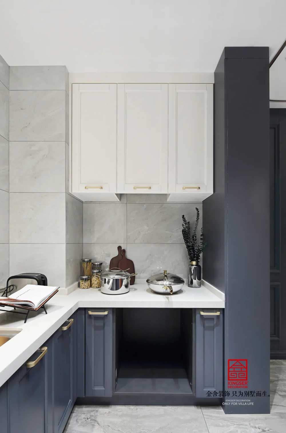 深藍(lán)、古銅和灰色調(diào)勾勒出紳士的高雅格調(diào)和品味。從空間利用到配色處理,匠心獨(dú)具,每一個(gè)空間都濃縮著設(shè)計(jì)師對(duì)新古典的獨(dú)特理解。