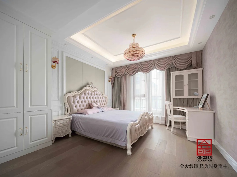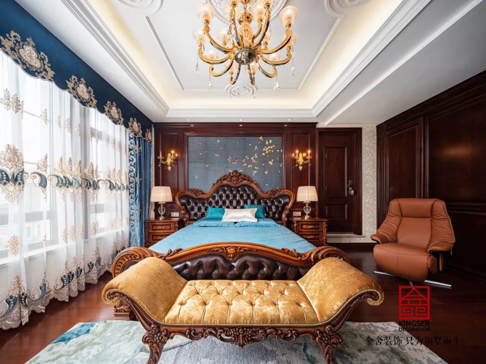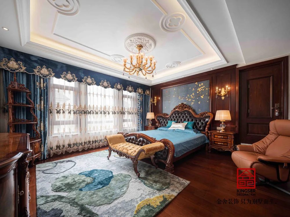 磅礴大氣的設(shè)計技巧,無論是厚重的實木地板,還是奢華的歐式家具,還是尊貴典雅的吊頂,都讓整個臥室呈現(xiàn)空前絕后的豪華風(fēng)格,而整個布置精妙,將各種家具, 裝飾物巧妙的融合在一起,把這種奢華的面貌呈現(xiàn)給人們。