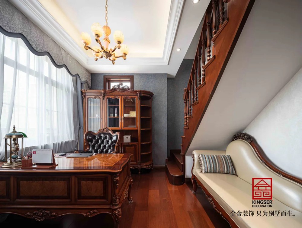 書房建在頂層閣樓的下方,在心情煩躁的時候可以去閣樓感受下自然的陽光和雨露。深棕色實木家具雕刻的花紋體現(xiàn)了設(shè)計師對細(xì)節(jié)的拿捏,獨到的細(xì)節(jié)之美。