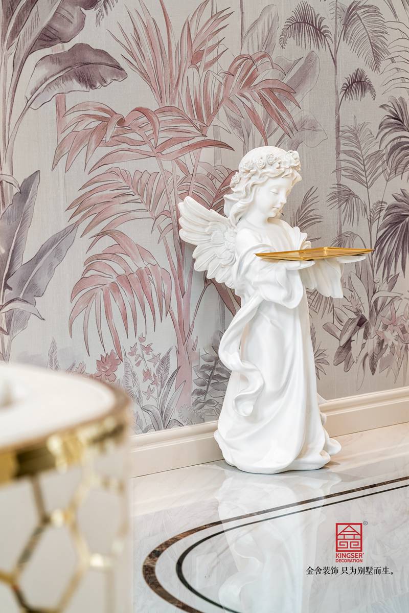 本案為金舍裝飾榮盛御府別墅裝修實(shí)景,灰白色的空間中,任何顏色的出現(xiàn)都會(huì)暈染出一分純潔中的靚麗,浪漫主義的風(fēng)格讓整個(gè)空間即素雅又靈動(dòng)。茶幾以及布藝的沙發(fā)搭配,提升了整個(gè)空間的質(zhì)感與設(shè)計(jì)美感。