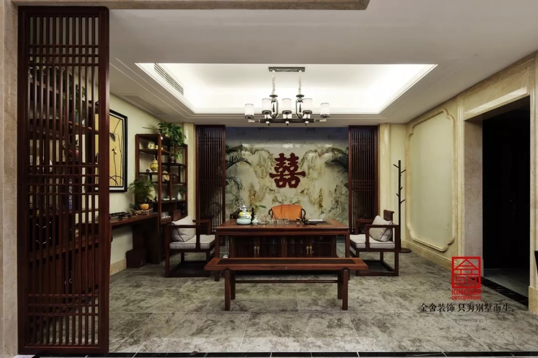 此案例為石家莊金舍裝飾-原河名墅600平米新中式風(fēng)格裝修實景。沏一杯普洱茶生茶,摘一曲春華絲竹,一花合歡溫心志,是信手拈來的東方古意,竟也能驚艷兩個人的素常歲月。一組桌椅,一縷時光,一眾好友,于陽光深處,傾心布茶盞,笑談四季流轉(zhuǎn),對飲山高云淡。