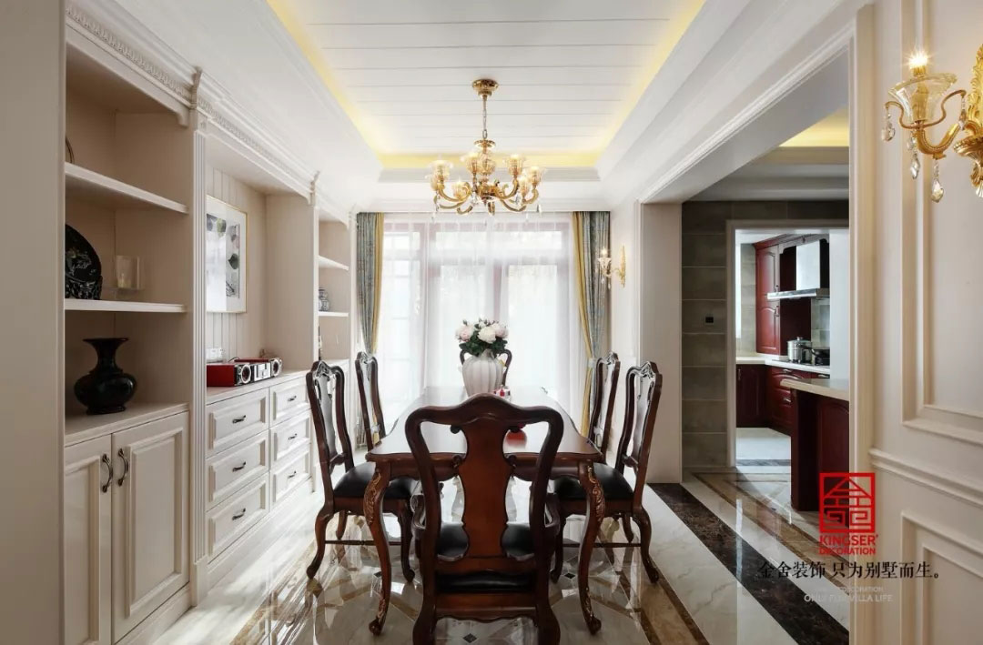 不再拘泥于平面,而是用高低差來做出空間的變化,使空間出現(xiàn)錯落感。餐廳半開敞的設(shè)計很有西式廚房的風格,餐廳金色的歐式吊燈融入復(fù)古元素,鐫刻著奢華與精美。