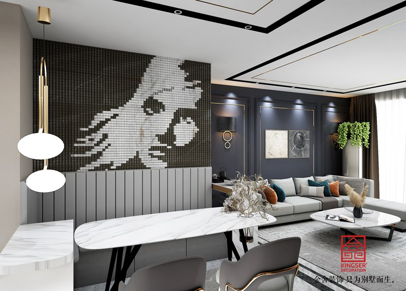 設(shè)計說明:現(xiàn)代輕奢的風(fēng)格演繹手法,以其強對比的材質(zhì)關(guān)系、精致細節(jié)來彰顯產(chǎn)品的高品質(zhì)和輕奢感?,F(xiàn)代港式風(fēng)格注重居室的實用性,同時體現(xiàn)了現(xiàn)代大都會生活的雅致與時尚,符合現(xiàn)代人的新概念生活品味。 以獨特的審美視覺,將懷舊的港式情懷與現(xiàn)代生活需求相結(jié)合,入戶花園結(jié)合自然的舒適感,奏響時間維度的光影流動,推動歲月的齒輪,游弋其間,此唱彼和。 美好從歸家這一刻開啟,精致的玄關(guān),打造出氣質(zhì)獨特的玄關(guān)端景,那時尚的雕像活靈活現(xiàn),仿佛期盼著歸家的主人,伸手撫順絨毛,將鑰匙皮包放入柜子,卸下浮沉的疲倦,在長椅上換上拖鞋,正式進入居家狀態(tài)。這是何種靜謐,何種愜意,促成“歸家團聚”的美好。