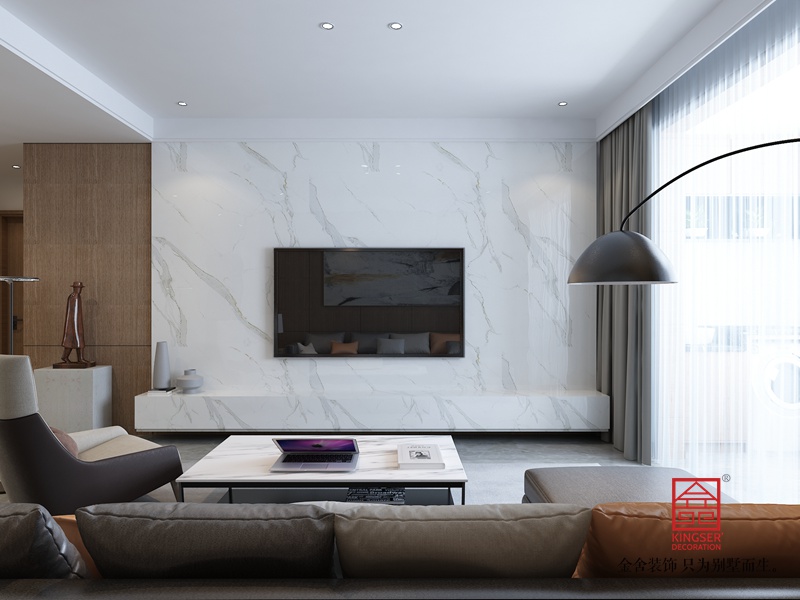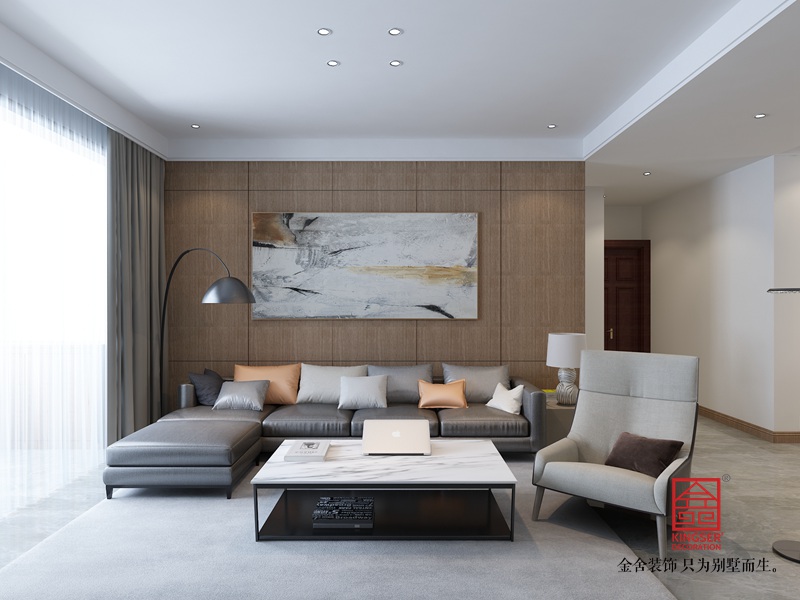 舒適的皮質(zhì)沙發(fā)、精簡的四角茶幾、寬敞的電視屏幕,層疊的輕盈呼之欲出,傳遞著寫意浪漫的生活美,仿佛能在夜霧或晨霜中,聽到客廳清淺的呼吸。軟裝,讓空間更加富有情調(diào)。
