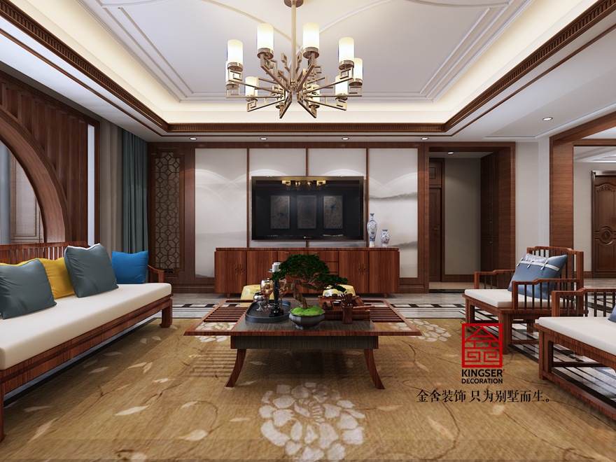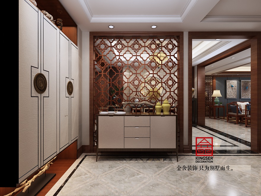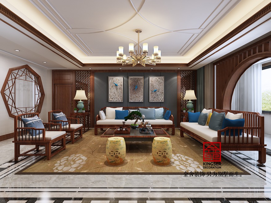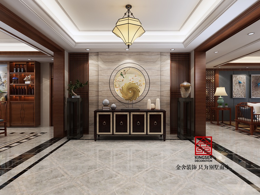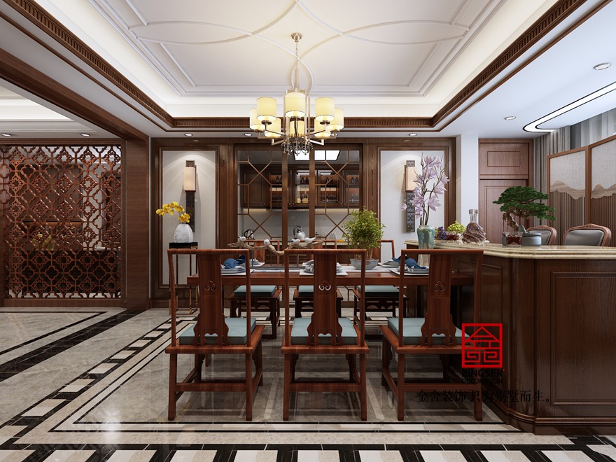 設計說明:此案例為石家莊金舍裝飾-御河上院219平米新中式裝修效果圖。
