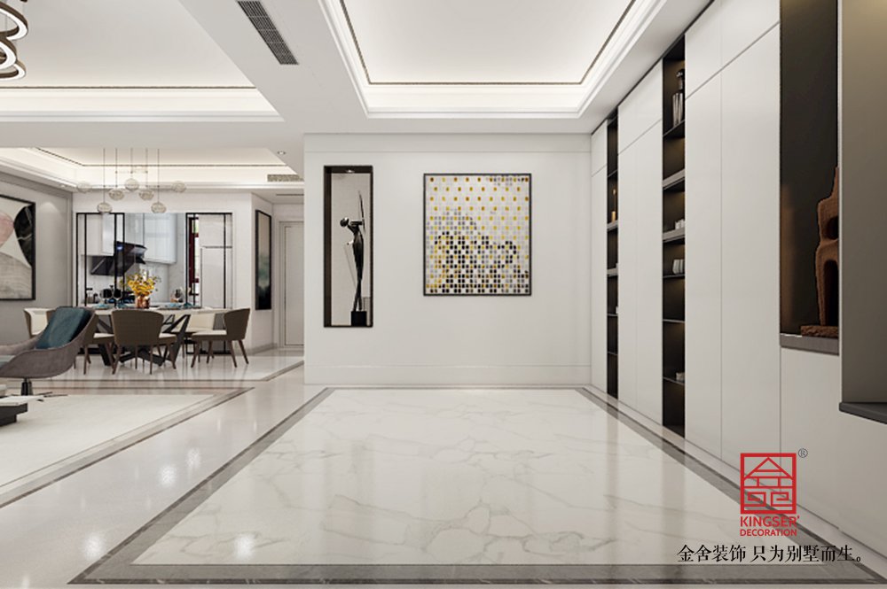 此案例為石家莊金舍裝飾-西山林語二期260平米極簡風格裝修效果圖。配色方案設計上沒有用過多的色彩,以簡單自然的顏色來劃分空間與局域,整體大多使用開放式的設計,整合生活空間,拓展空間視覺感。家具方面強調功能性設計,線條簡約流暢干凈.