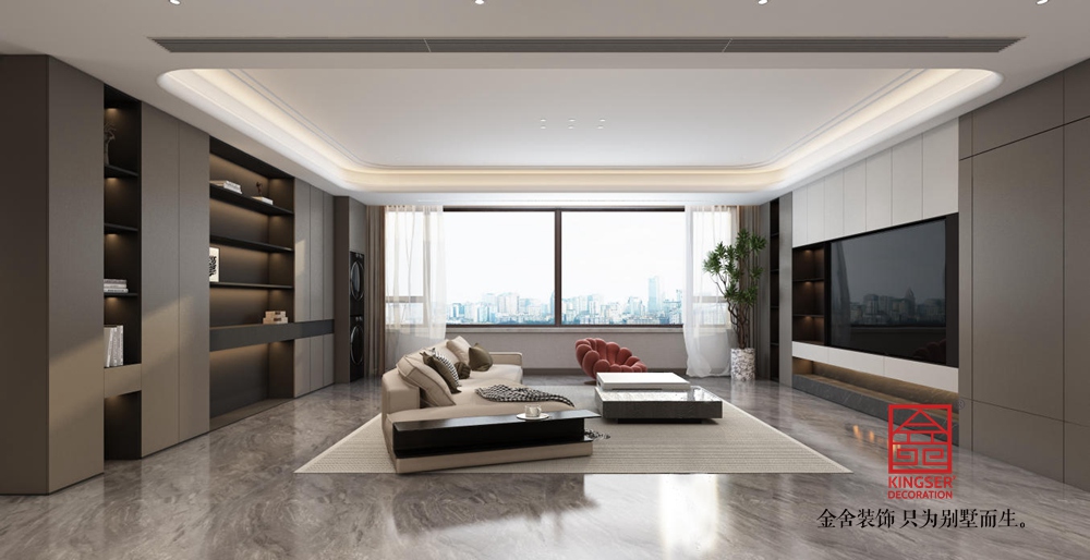 空間布局上,采用開放式設計,讓客廳與周邊區(qū)域自然銜接,增強了空間的通透感與互動性。大面積的落地窗是設計亮點,引入充足自然光線,同時將城市景觀納入室內,使空間與外界環(huán)境有機融合。