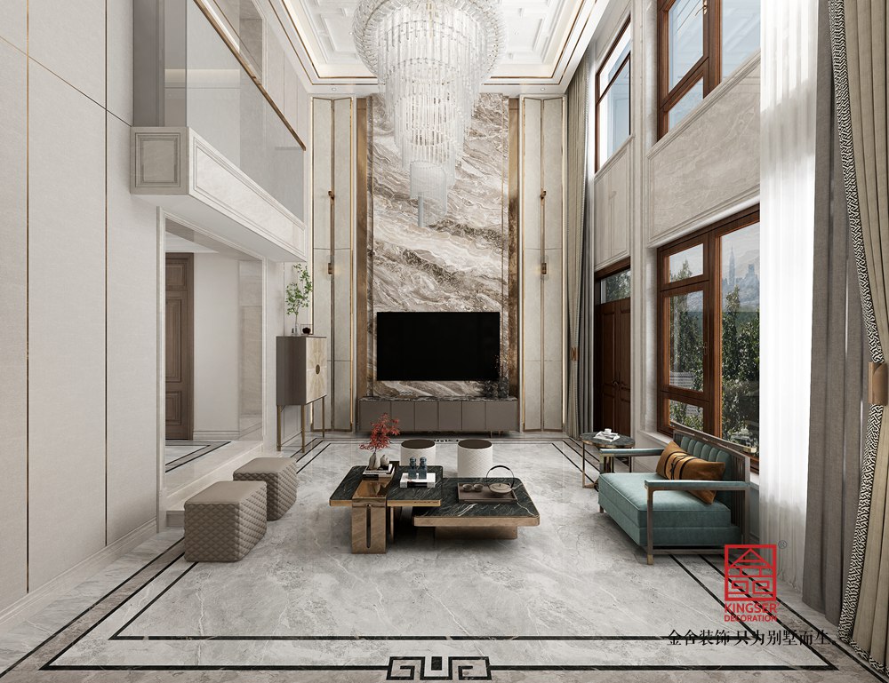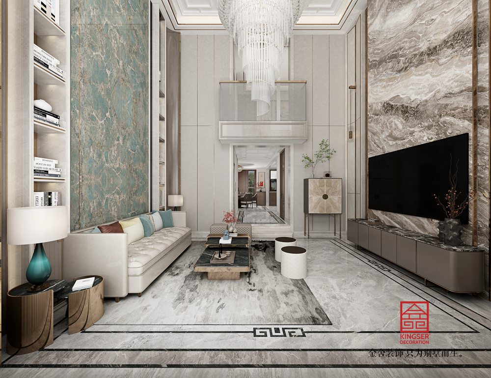 設(shè)計(jì)說(shuō)明:本別墅客廳設(shè)計(jì),以現(xiàn)代輕奢風(fēng)格為基調(diào),融合精致與大氣??臻g上,挑高設(shè)計(jì)搭配水晶吊燈,拉伸視覺,營(yíng)造開闊感。材質(zhì)運(yùn)用考究,大理石墻面與地面,紋理自然且質(zhì)感高級(jí),金屬元素在家具、裝飾線條中點(diǎn)綴,增添奢華感。色彩以淺色系為主,搭配局部藍(lán)綠色軟裝,柔和又富有層次。整體布局兼顧功能與美學(xué),家具造型簡(jiǎn)約大氣,細(xì)節(jié)處盡顯精致,打造出舒適且具品質(zhì)感的別墅起居空間。