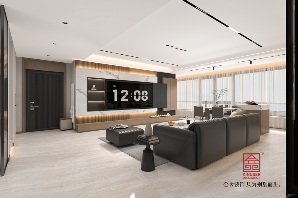 材質(zhì)上融合不同質(zhì)感,電視背景墻用大理石紋理提升高級感,木質(zhì)線條增添溫潤氣息,淺灰色地毯則柔化地面硬度,讓空間更顯溫馨。