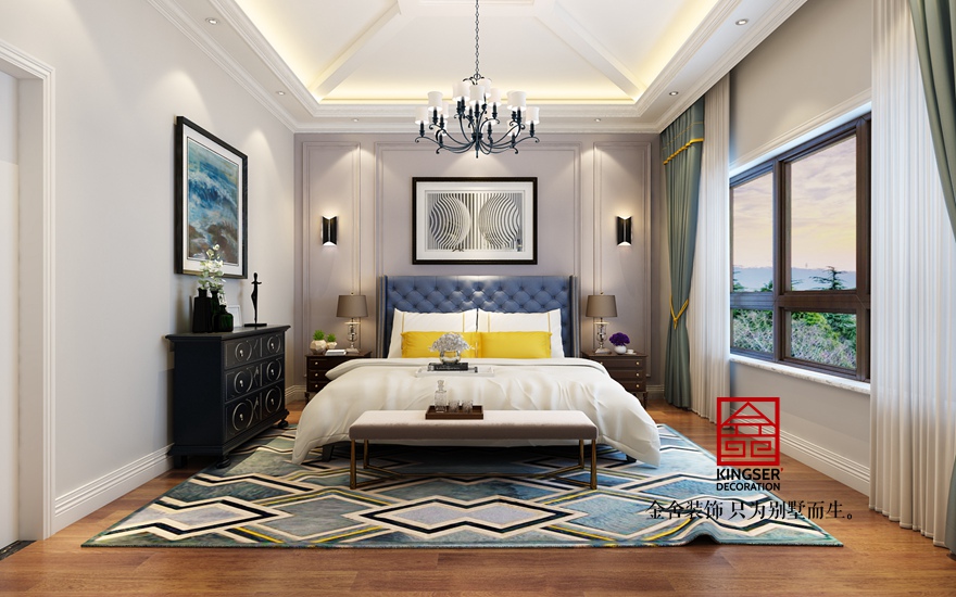 主臥在放高足夠的情況下采用了“回”字形吊頂,第二階的“口”字形造型把整個空間向上拉伸,顯得空間更加寬敞、高大??紤]到臥室的休息性,在色調(diào)上采用了淺灰色作為背景墻的主色調(diào),即溫和又不會顯得沉悶,有助于提高業(yè)主的睡眠質(zhì)量。經(jīng)典的美式“三段式”’造型,沒有過多復(fù)雜邊線,簡潔干練,搭配頗有現(xiàn)代感的金屬燈飾及飾品,使整個空間簡而不失潔時尚。整體的方案圍繞清新的美式風(fēng)格的簡單舒適,質(zhì)樸典雅來設(shè)計,石家莊金舍裝飾設(shè)計師完美詮釋了業(yè)主的提出的“簡潔而不簡單”的沒事風(fēng)格,也體現(xiàn)了業(yè)主對高品質(zhì)生活的要求。